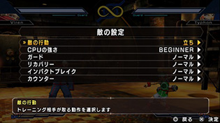 いつでもどこでもコンボの練習が可能なトレーニングモードを採用。CPUの強さを選べるだけでなく、オフェンスとディフェンスの2つのゲージの溜まり方や、攻撃、ガード、反撃などの挙動まで細かく設定し、腕を磨くことができます。